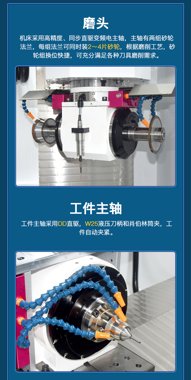 QD680六軸五聯(lián)動數(shù)控工具磨床,適用于生產(chǎn)或修磨小規(guī)格銑削類刀具、鉆削類刀具、成形刀具等